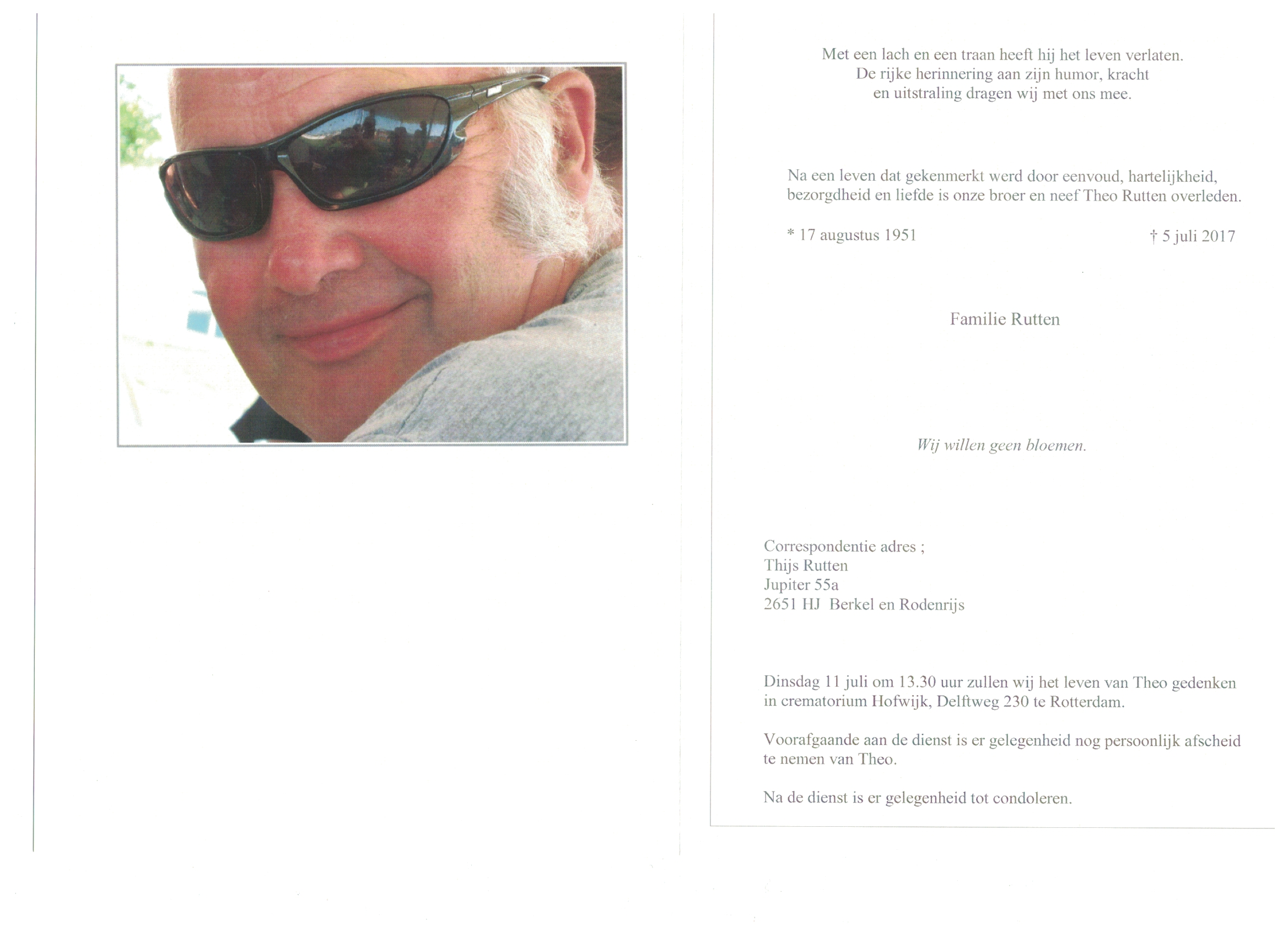 Woensdag 5 juli is mijn broer Theo Rutten overleden. Theo heeft de laatste weken van zijn leven gebruikt om samen met vrienden en familie herinneringen op te halen.
